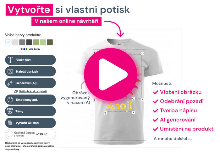 Vyzkoušej náš návrhář potisku triček, textilu, dárků a reklamních předmětů. Díky našim skvělým AI funkcím si snadno vytvoříš ten nejlepší, nejoriginálnější a nejpreciznější potisk, který vzbudí obdiv všude, kam přijdeš!
