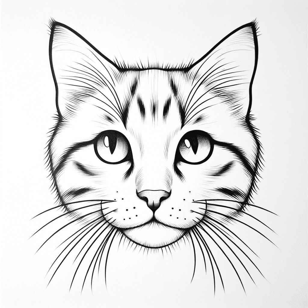 Kreslený obličej kočky s důrazem na oči, čumák s fousky a ouška, bez orámování hlavy. Ideální pro potisk produktů, přináší jedinečný a atraktivní design. Perfektní pro milovníky koček a umění.