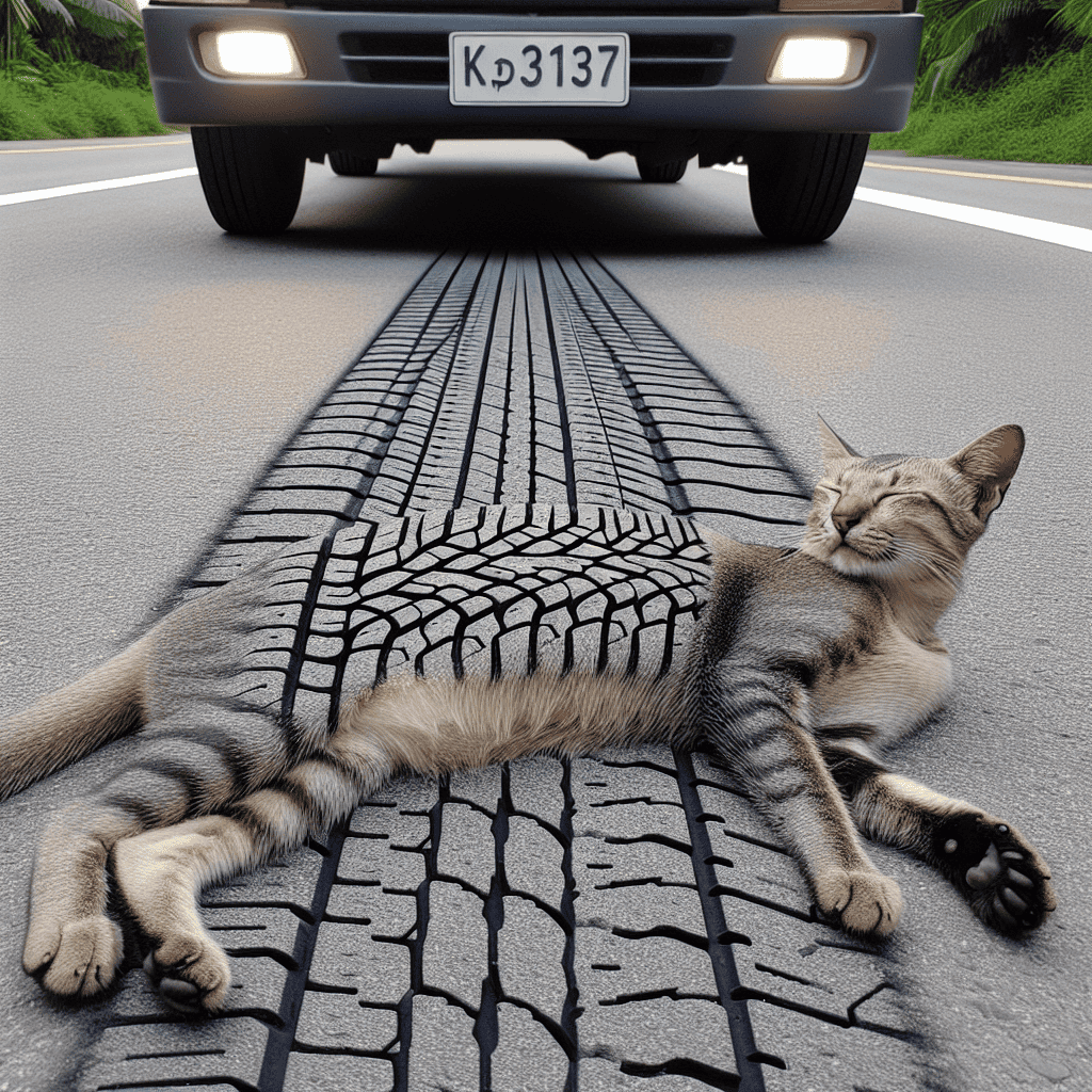 Placatá kočka na silnici s otisklým vzorem pneumatiky na zádech