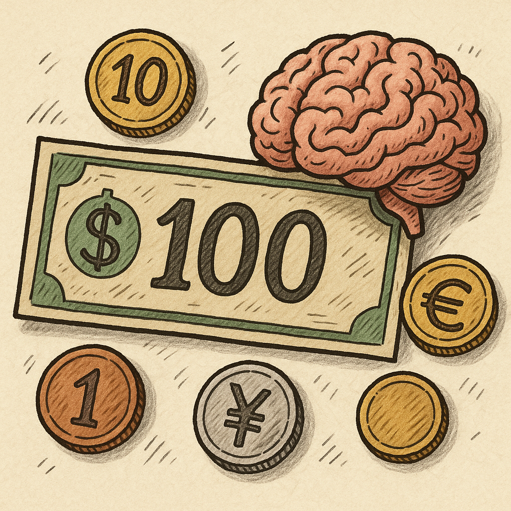 Vytvoř my obrázek bankovky a okolo ní mince a mozek a aby to vypadalo spíše kreslene