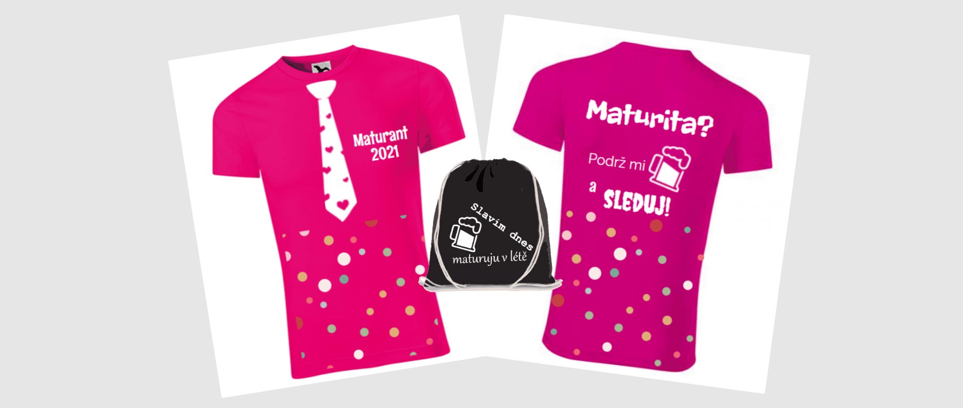 Maturitní trička, tílka nebo mikiny jsou oblíbeným památečním textilem, protože připomínají jedinečný neopakovatelný den, který patří jen a jen Vaší třídě.