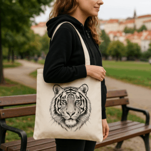 Chceš vyjádřit svoji divokou stránku? Tahle bavlněná taška s potiskem "Tiger" ti bude padnout jako ulitá. S dlouhými rukojeťmi pro pohodlné nošení a zesílenými švy pro trvanlivost. Rozměry 38x42cm ti poskytnou dostatek prostoru a díky možnosti praní na 40°C a sušení v sušičce při nízké teplotě ti taška uspokojí i veškeré praktické potřeby. Osvoboď svou divočinu s touto originální taškou!