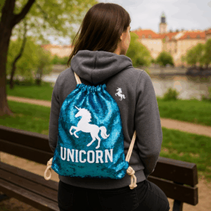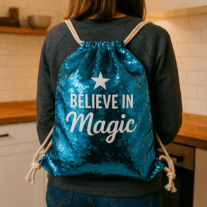 Vytvoř si originální potisk na tento krásný flitrový oboustranný vak, přidej text, obrázek či svou oblíbenou fotografii a udělej radost sobě nebo svým blízkým.