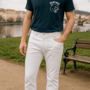 Elegantní a pohodlné pánské kalhoty vhodné pro potisk. Úzký střih podtrhuje postavu, zatímco pevný pas s poutky na opasek dodává luxusní vzhled. Zip a praktické kapsy zajišťují funkčnost, zatímco elastan přidává pohodlí. Vhodné pro potisk s vlastním motivem. Velikosti dle francouzské tabulky pro perfektní fit.