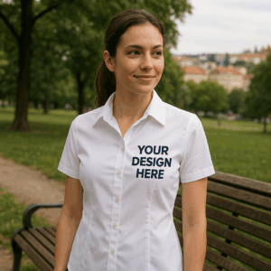 Elegantní popelínová halenka s krátkým rukávem je skvělou volbou pro potisk! Má lehce vypasovaný střih, knoflíkovou légu bez viditelných švů a zaoblený lem pro pohodlné nošení. Záševky na přední a zadní straně dodávají halence unikátní vzhled. Ideální vlastnosti pro každodenní nošení – lze prát na 40° a není vhodná do sušičky.