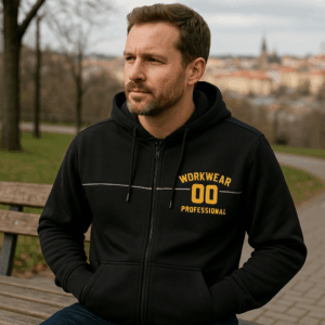 Stylová pracovní mikina s kapucí zaručí pohodlnost a skvělý vzhled. Má moderní design s rybou kostí zdobenou krční lemovkou a stříbrným lemováním. Díky půlměsícové podsádce na krku a elastickým softshellovým vsadkám je ideální pro každodenní nošení. Kapsy a poutko na zavěšení dodávají praktickost. S 2-vrstvou kapucí se šňůrkou a žebrovanými lem a manžetami je skvělou volbou pro chladnější dny. S dekorem TearAway a možností praní na 40°C je snadno udržovatelná a není třeba chemicky čistit či sušit v sušičce.