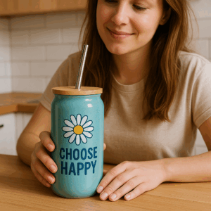 Sklenice s brčkem a bambusovým víčkem s vlastním potiskem