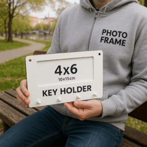Fotorámeček – věšák – pro potisk sublimační technologií. Rámeček je vyroben z lisované dřevotřísky (MDF), háčky jsou z kovu ve zlaté barvě.