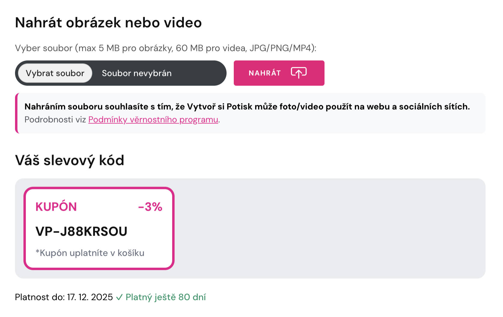 Po schválení se kód zobrazí ve vašem účtu v sekci Věrnostní program a uplatníte jej v košíku.